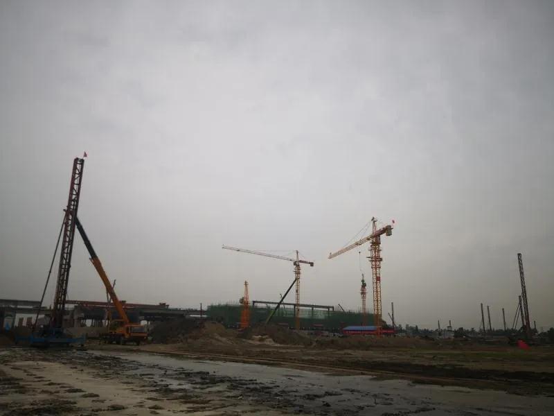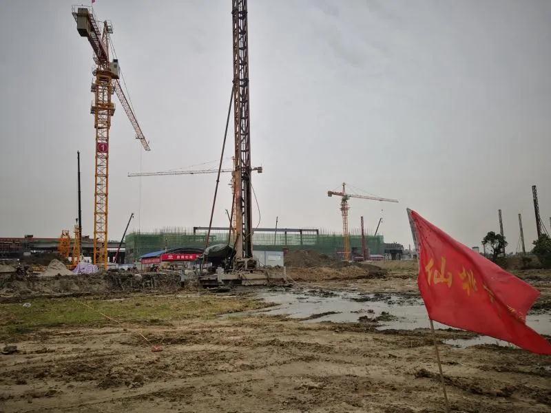 5月19日上午武仙城际铁路仙桃火车站城市配套建设工程施工现场头戴安全帽的工人正紧张施工桩基、挖机等大型机械设备挥舞铁臂来回作业。