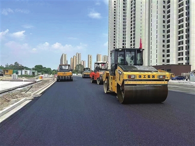 市城发投集团市政公司负责新三中片区金台路、前通路、新城大道、朝阳大道、博雅大街、永康路等 6条次干路的建设任务,经过两年的建设,该片区工程目前已接近尾声。图为8月28日,施工现场。